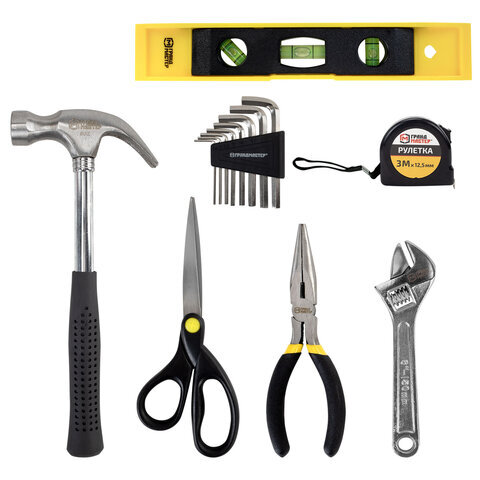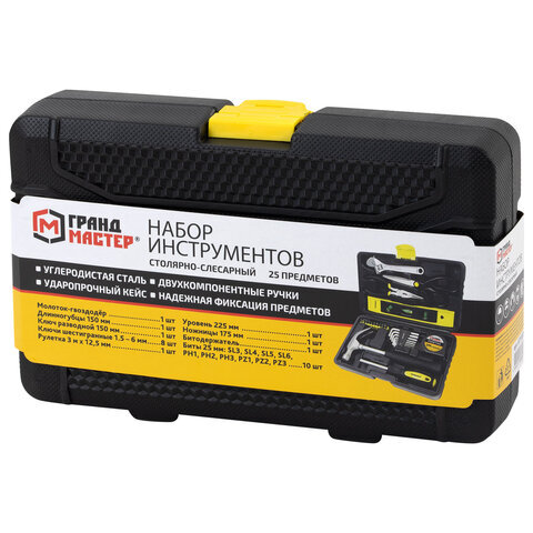 Столярно-слесарный набор ГРАНДМАСТЕР включает в себя необходимые инструменты для использования в быту. Состав набора позволит выполнить мелкий ремонт дома и на даче, а также пригодится для ремонта колесной и бытовой техники.