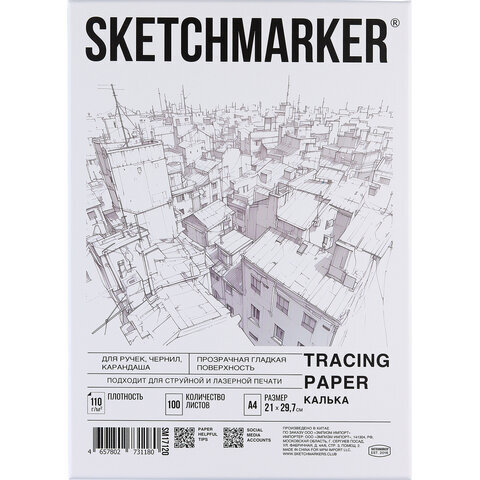 Калька А4 для печати и творчества, 110 г/м2, 100 листов, SKETCHMARKER, SM17120