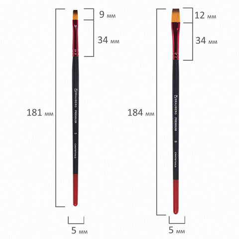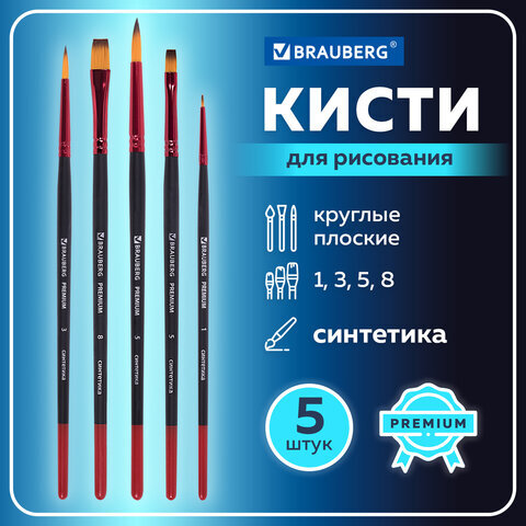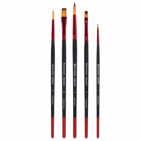 Кисти BRAUBERG PREMIUM, набор 5 шт. (синтетика, круглая № 1, 3, 5, плоская № 5, 8), блистер, 201024