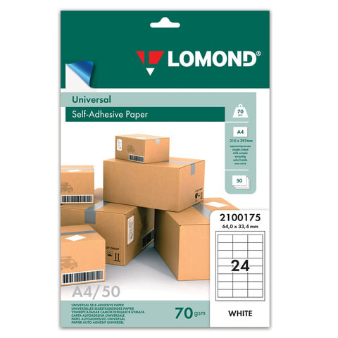 Этикетка самоклеящаяся 64,6х33,4 мм, 24 этикетки, белая, 70 г/м2, 50 листов, LOMOND, 2100175