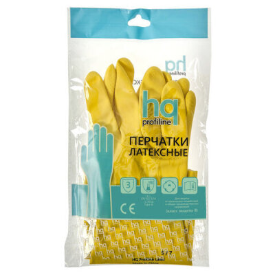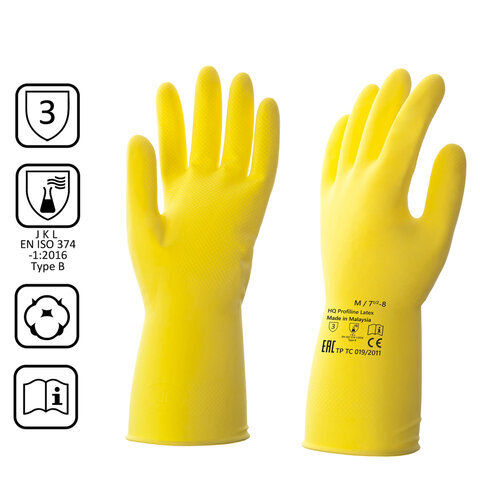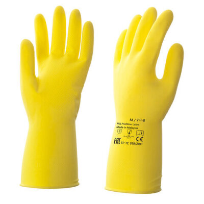 Перчатки латексные КЩС, сверхпрочные, плотные, хлопковое напыление, размер 7,5-8, M (средний), желтые, HQ Profiline, 73584