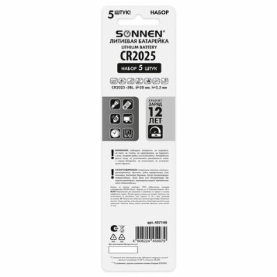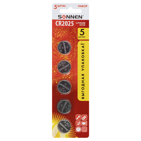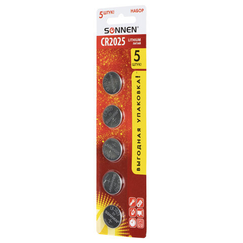 Батарейки литиевые SONNEN Lithium CR2025, "таблетки, дисковые, кнопочные", КОМПЛЕКТ 5 шт., блистер, 457140