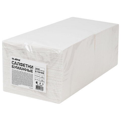 Салфетки бумажные 3-х слойные, 33x33 см, 200 штук в упаковке, 1/4 сложение, LAIMA, белые, 116659