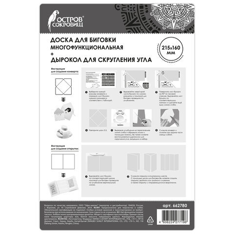 • Доска для биговки ОСТРОВ СОКРОВИЩ предназначена для создания сгибов при создании открыток, скрап-альбомов, конвертов. Дырокол в комплекте используется для скругления угла изделий. Качественный и удобный набор станет надежным помощником в рукоделии.