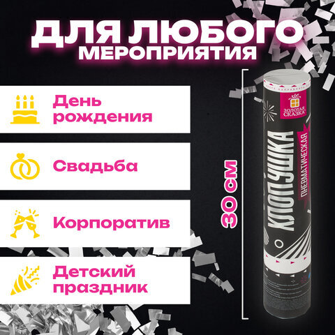 Пневматическая хлопушка ЗОЛОТАЯ СКАЗКА предназначена для создания отличного настроения и настоящего веселья на любом празднике - новогодней вечеринке, торжестве в честь Дня Рождения, выпускном, корпоративе или любом другом праздничном событии.