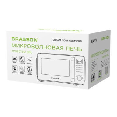 • Микроволновая печь BRASSON MW2070D-8BL – идеальное сочетание надежности и стиля. Компактная и мощная печь точно порадует вас разнообразным функционалом и простым управлением.