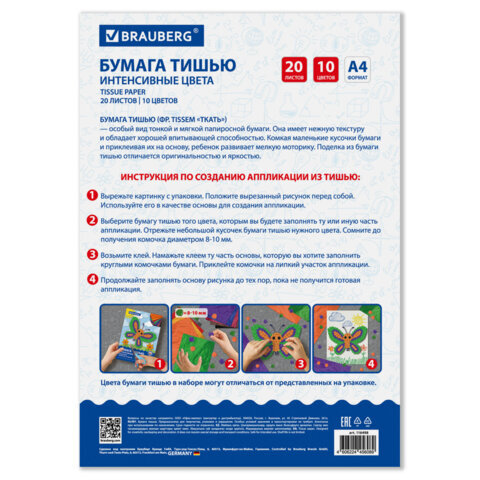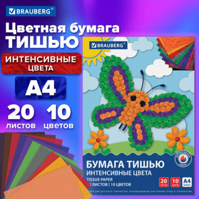 Цветная бумага ТИШЬЮ 17 г/м2, А4 (210х297 мм), 20 листов, 10 цветов интенсив, в папке, BRAUBERG, 116498