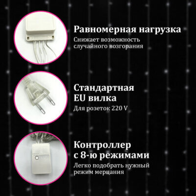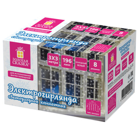 Электрогирлянда-занавес комнатная "Штора" 3х3 м, 196 LED, холодный белый свет, 220 V, ЗОЛОТАЯ СКАЗКА, 591353