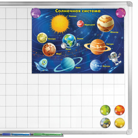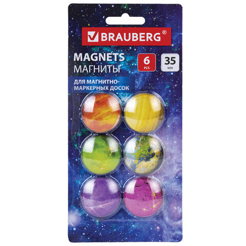 Круглые стеклянные магниты BRAUBERG со стильным 3D-дизайном "Планеты" надежно прикрепят листы бумаги к магнитно-маркерной поверхности досок, флипчартов и холодильников.