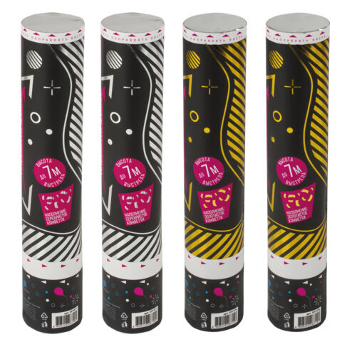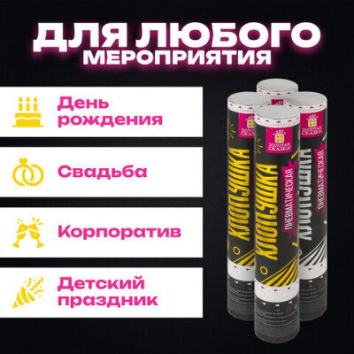 Пневматическая хлопушка не является пиротехникой и работает на основе энергии сжатого воздуха. Конфетти и серпантин ярких цветов можно использовать в помещении или на улице. Хлопушка подойдет для праздников, концертов, реквизита для фотосессии.