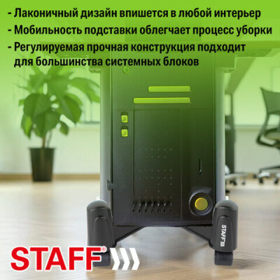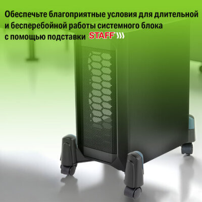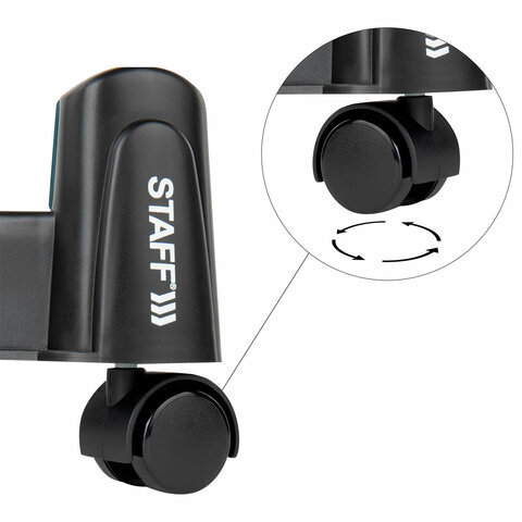 Передвижная подставка для системного блока STAFF. Мобильность подставки позволяет передвигать системный блок компьютера без усилий, не повреждая напольное покрытие. Благодаря этому появляется возможность производить более тщательную уборку рабочего места.