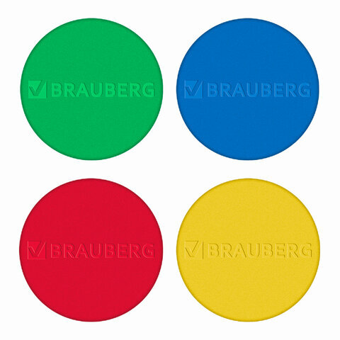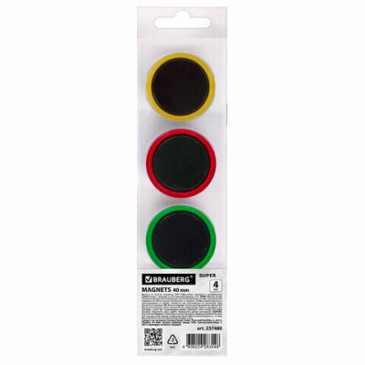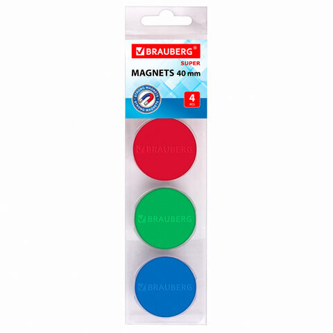 Магниты МОЩНЫЕ 40 мм (БОЛЬШОГО ДИАМЕТРА), НАБОР 4 шт., ассорти, BRAUBERG "SUPER", 237480