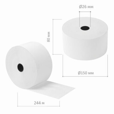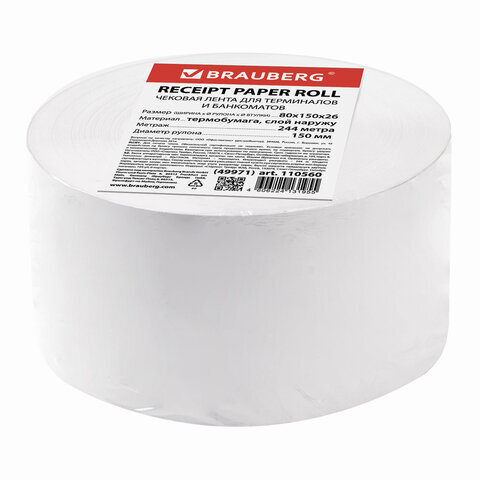 Чековая лента ТЕРМОБУМАГА 80 мм (диаметр 150 мм, длина 244 м, втулка 26 мм) слой наружу, BRAUBERG, 110560