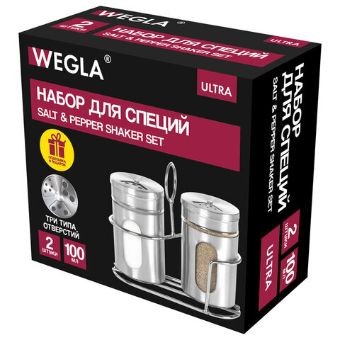Набор для специй 2х100 мл, ULTRA, подставка + солонка + перечница, 3 типа отверстий, WEGLA (ВЕГЛА), 700235