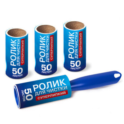 Ролик для чистки одежды / мебели от шерсти, ворсинок, пыли, волос + 4 сменных блока по 50 листов, суперлипкий, LAIMA, 608383