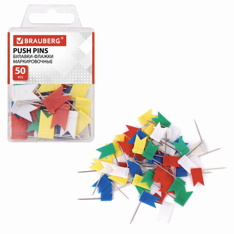 Булавки-флажки маркировочные BRAUBERG, цветные, 50 шт., пластиковая коробка, европодвес, 221537
