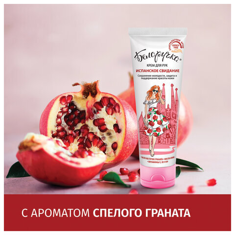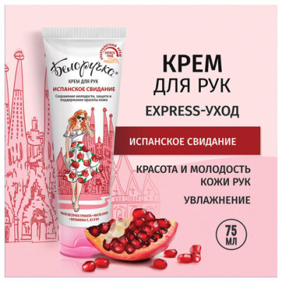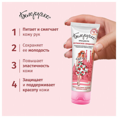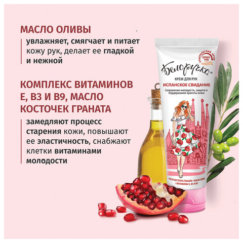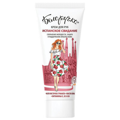 Крем для рук БЕЛОРУЧКА "Испанское свидание" питает кожу, стимулирует ее обновление, обеспечивает антиоксидантную защиту и способствует сохранению молодости и красоты.