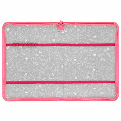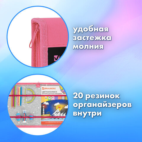 Папка на молнии BRAUBERG с ручкой и органайзером. Внутри папки – крепления для канцелярских и письменных принадлежностей. Застежка-молния расположена по периметру папки.