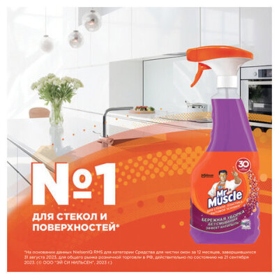 Чистящее средство для мытья стекол, пластика и бытовой техники МИСТЕР МУСКУЛ "Лаванда" эффективно удаляет пыль с поверхностей. Надежный триггер обеспечивает удобство использования и рассчитан на повторное использование со сменной бутылкой.