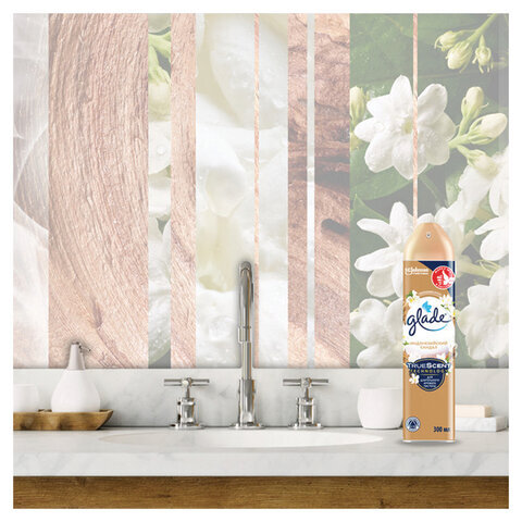 • Нежные ноты весеннего жасмина и бергамота в сочетании с ароматами амбры и сандалового дерева окружат вас комфортом и создадут атмосферу роскошного спа-салона у вас дома. GLADE гарантирует безопасность и экспертную формулу своих аэрозолей!