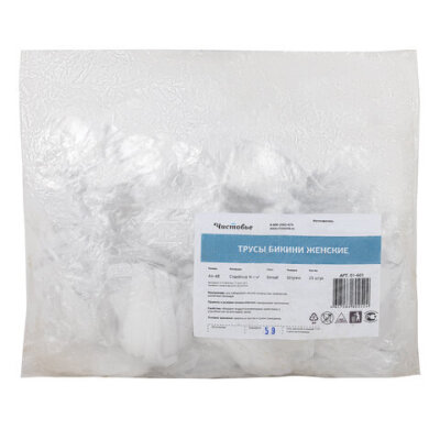 Одноразовые трусики-бикини ЧИСТОВЬЕ из белого спанбонда плотностью 30 г/м2. Размер - 44-48, в одной упаковке 25 штук.