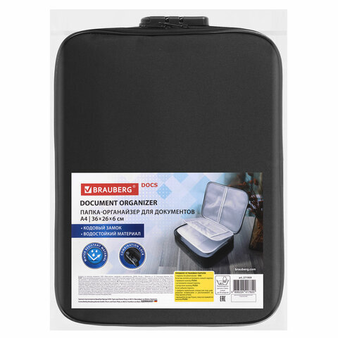 Папка-органайзер для документов с кодовым замком ЧЕРНЫЙ ВОДОНЕПРОНИЦАЕМЫЙ А4, BRAUBERG DOCS, 271959