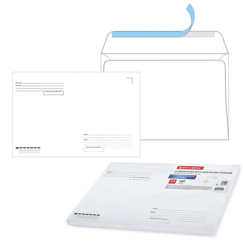 Конверты С4 (229х324 мм), отрывная лента, "Куда-Кому", 100 г/м2, КОМПЛЕКТ 25 шт., BRAUBERG, 121853