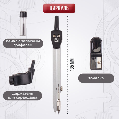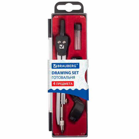 Готовальня BRAUBERG "Architect", 4 предмета: циркуль 135 мм, держатель для карандашей, точилка, грифель, 210657