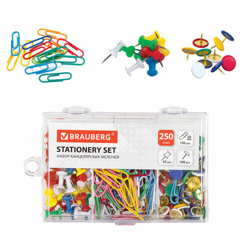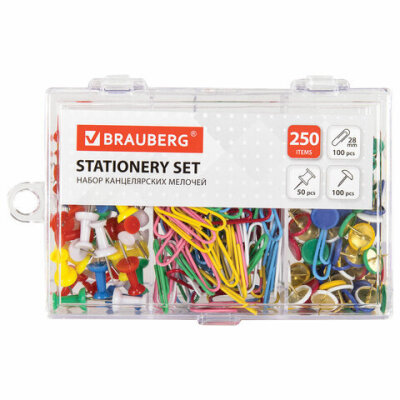 Набор канцелярских мелочей BRAUBERG объединяет в себе скрепки, канцелярские и силовые кнопки. Упаковка одновременно является и органайзером для хранения канцелярских мелочей на столе.