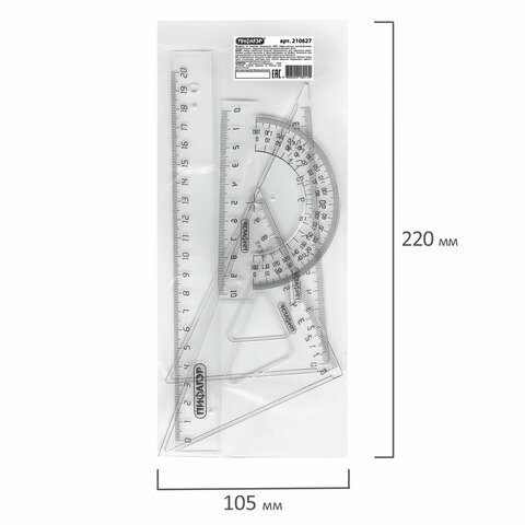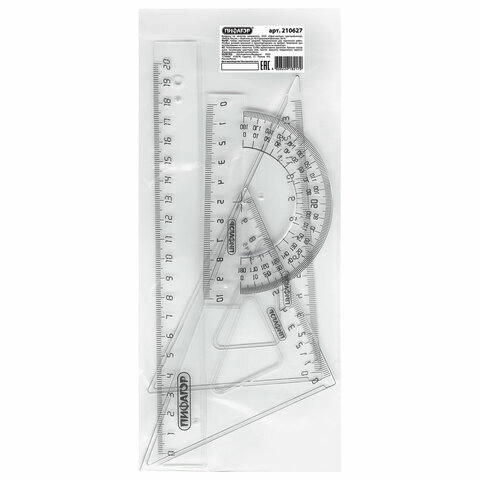 Набор чертежный средний ПИФАГОР (линейка 20 см, 2 треугольника, транспортир), прозрачный, бесцветный, пакет, 210627
