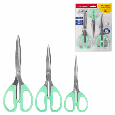 Ножницы BRAUBERG "CLASSIC PRO" 3 шт. (155, 185, 210 мм), мятные ручки, ВЫГОДНАЯ УПАКОВКА, 272979