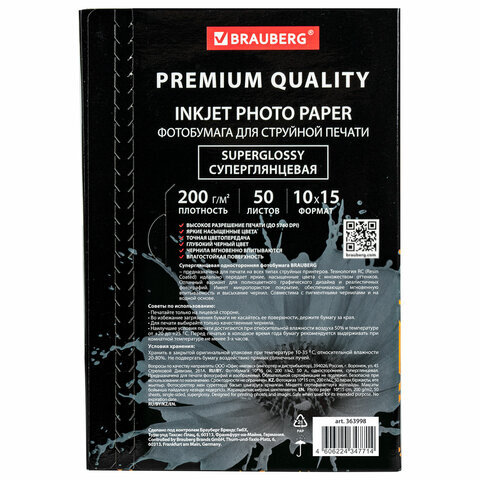 Фотобумага PREMIUM суперглянцевая, 10х15 см, 200 г/м2, односторонняя, 50 листов, BRAUBERG, 363998