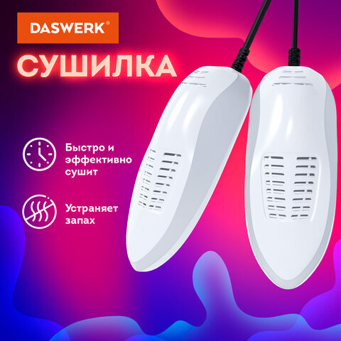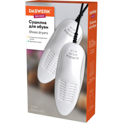 Сушилка для обуви DASWERK создана для бережного и безопасного ухода за обувью. Особая технология нагрева уничтожает неприятный запах и дезинфицирует обувь, а эргономичная форма позволяет просушить даже самые труднодоступные места.