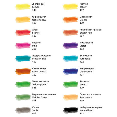 | Цвет | алый, бирюзовый, виридоновый зеленый, голубой или ярко-голубой, желто-зеленый, желто-оранжевый, желтый, изумрудный-зеленый, индийский красный, красно-фиолетовый, лазурный, лимонный, нейтрально-черный, охра желтая, сиена натуральная, ультрамарин, умбра жженая или марс коричневый, фиолетовый |