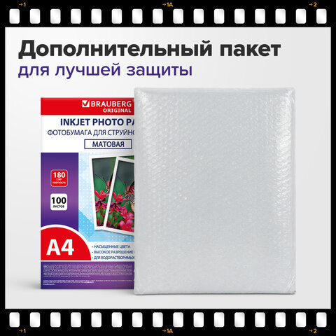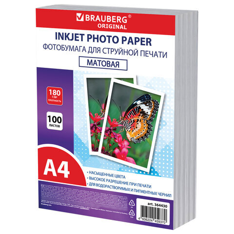 Фотобумага матовая, А4, 180 г/м2, односторонняя, 100 листов, ПАКЕТ, BRAUBERG ORIGINAL, 364430