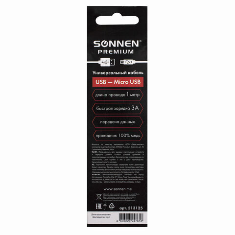 Кабель USB 2.0 – micro USB, 1 м, SONNEN Premium, медь, передача данных и быстрая зарядка, 513125