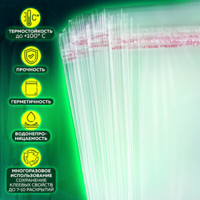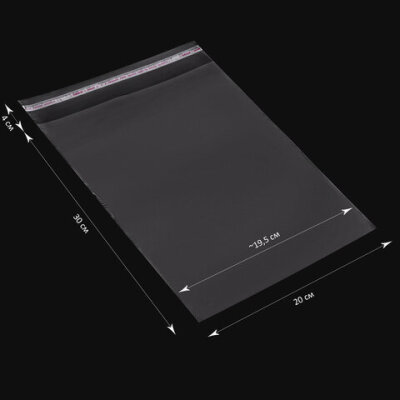 Пакет БОПП с клеевым клапаном, КОМПЛЕКТ 100 шт., 20х30+4 см, толщина 30 мкм, с усиленным швом