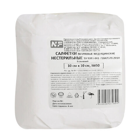 Салфетки марлевые нестерильные 10х10 см, 8 сложений, 50 шт., бумажный пакет, 32(±2) г/м2, NF