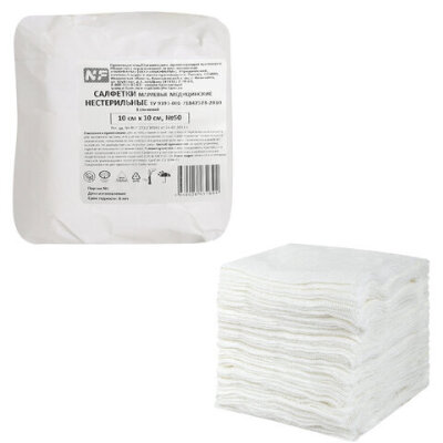 Салфетки марлевые нестерильные NF размером 10х10 см, плотность марли - 32(±2) г/м2.
