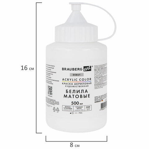 Краска акриловая художественная МАТОВАЯ 500 мл в банке, БЕЛИЛА титановые, BRAUBERG ART DEBUT, 192535
