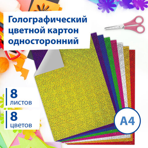 Картон цветной А4 ГОЛОГРАФИЧЕСКИЙ, 8 листов 8 цветов, 230 г/м2, "ЗОЛОТОЙ ПЕСОК", BRAUBERG, 124755