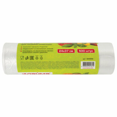 Пакеты фасовочные 24х37 см КОМПЛЕКТ 500 шт., ПНД, 8 мкм, рулон на втулке, LAIMA, 605952