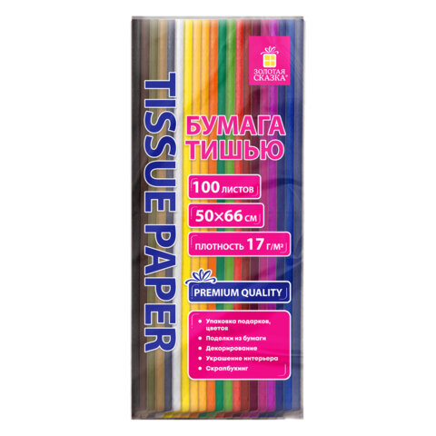 Цветная бумага ТИШЬЮ 17 г/м2, 50х66 см, 100 листов, 20 цветов, интенсив ассорти, ЗОЛОТАЯ СКАЗКА, 116496