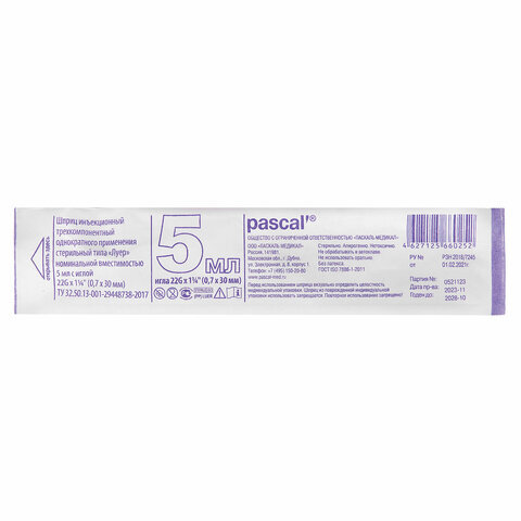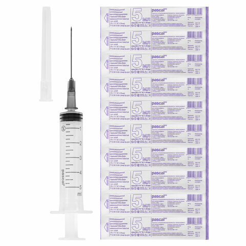 Шприц 3-х компонентный PASCAL, 5 мл, КОМПЛЕКТ 100 шт., в пакете, игла 0,7х30 – 22G, 120406
