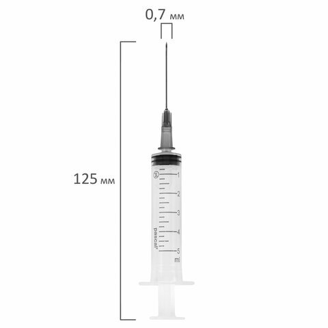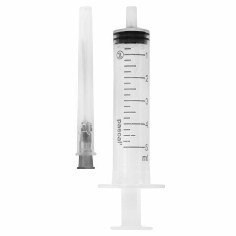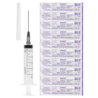Трехкомпонентный одноразовый шприц изготовлен из специального полипропилена. Нетоксичен, апирогенен. Объем – 5 мл, размер иглы – 22G.