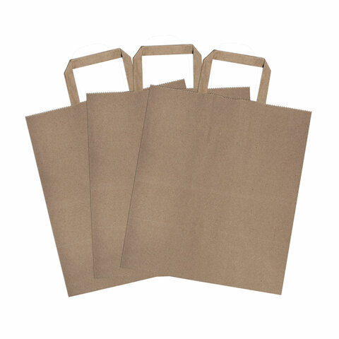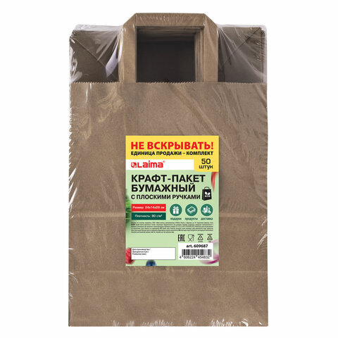 Крафт-пакет бумажный 24х14х29 см, КОМПЛЕКТ 50 шт., плоские ручки, плотность 90 г/м2, LAIMA ECO CRAFT, 609687