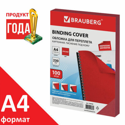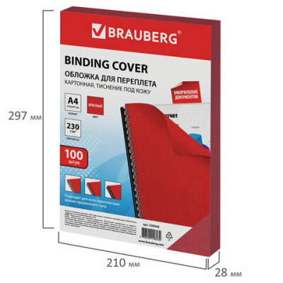 Обложки картонные для переплета, А4, КОМПЛЕКТ 100 шт., тиснение под кожу, 230 г/м2, красные, BRAUBERG, 530948