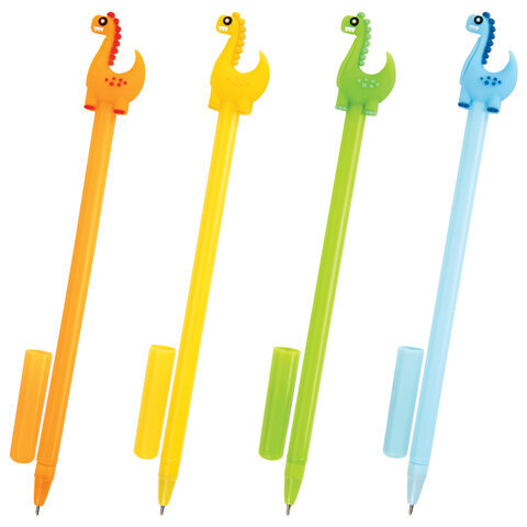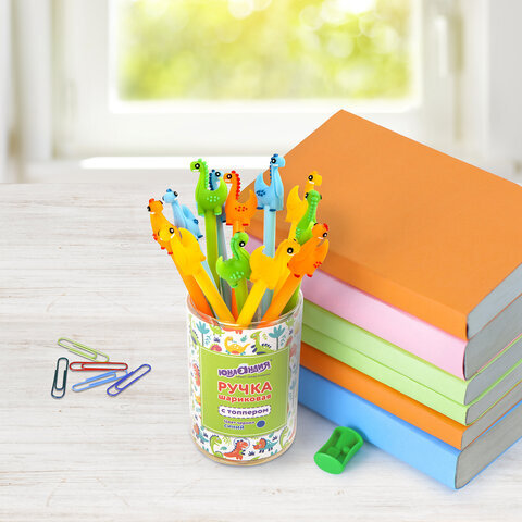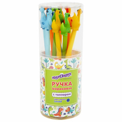 Ручка с топпером шариковая ЮНЛАНДИЯ "Динозаврик", корпус ассорти, СИНЯЯ, пишущий узел 0,7 мм, 143809