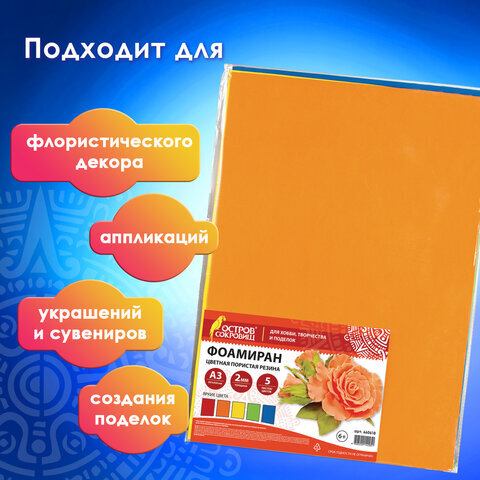 Пористая резина/фоамиран А3, 2 мм, НАБОР, 5 листов, 5 цветов, яркие цвета, ОСТРОВ СОКРОВИЩ, 660618
