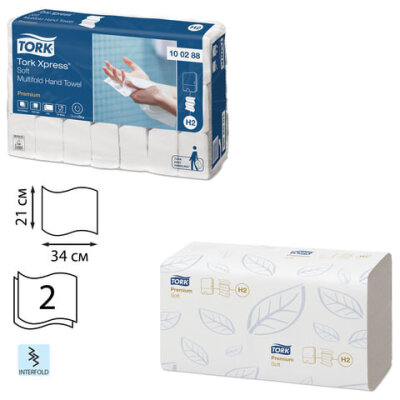 Полотенца бумажные 110 шт., TORK (H2) PREMIUM, КОМПЛЕКТ 21 пачка, 2-слойные, белые, 21х34 см, Z-сложение, 100288